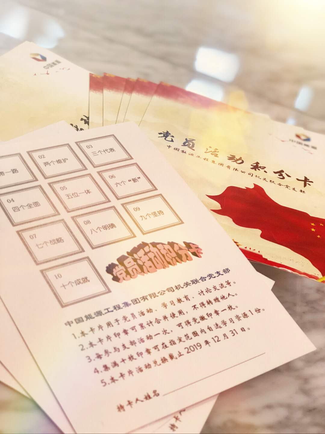 經(jīng)過一個多月的摸索,此次支部黨員大會上正式發(fā)布《黨員活動積分卡》。積分卡從“一”到“十”,羅列了十九大報告中的經(jīng)典名詞,將黨建知識與活動參與情況相結(jié)合,以集章兌換學習資源的方式,助力基層黨組織標準化建設(shè),打造服務(wù)型、學習型黨支部。